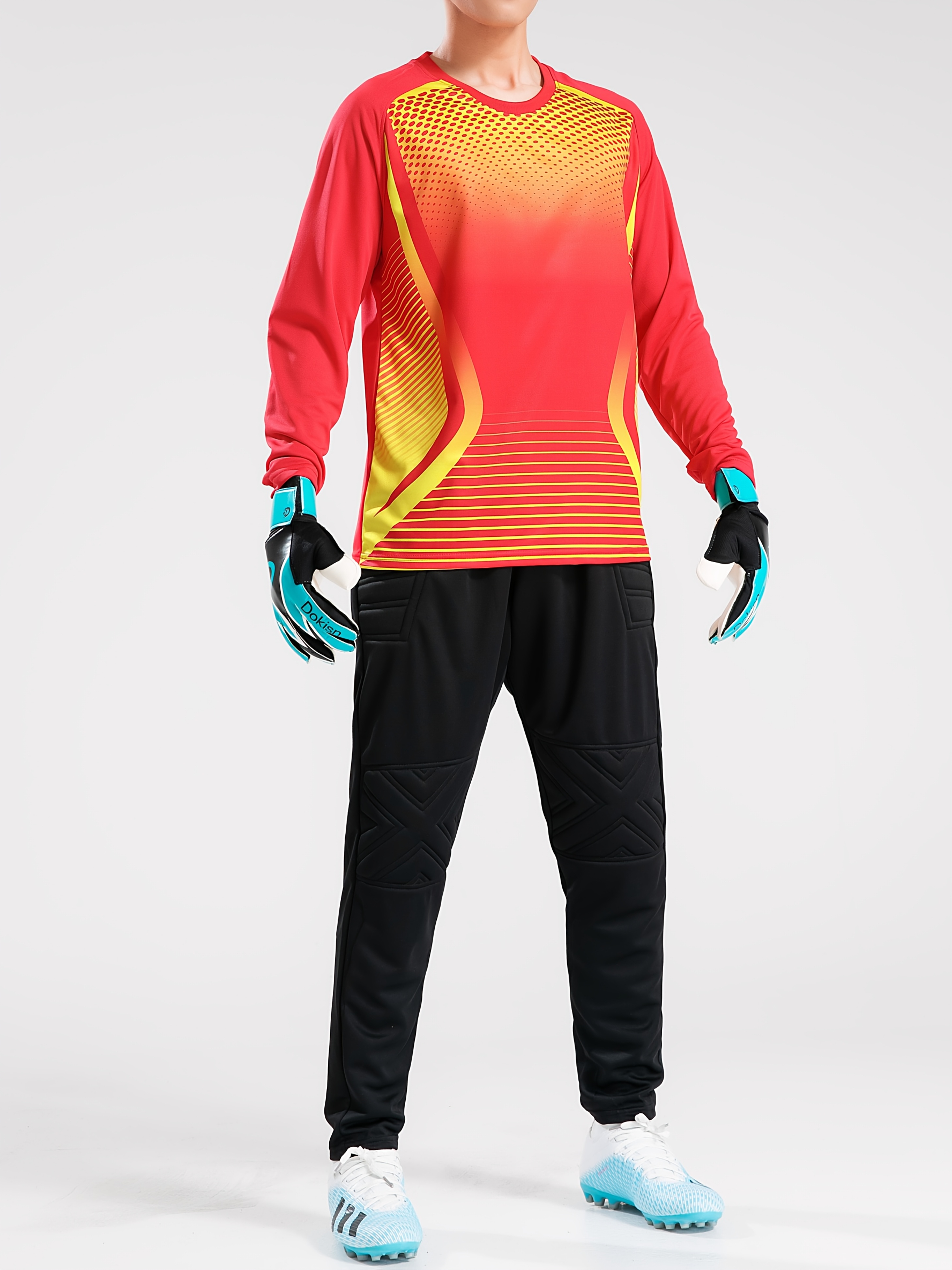 Protect yourself in style and efficiency with the 2-Piece Soccer Goalkeeper Set , consisting of a colorful long-sleeved shirt with a geometric print and specialized training pants. The breathable, quick-drying shirt ensures maximum freedom of movement, while the goalkeeper pants offer complete protection for intensive training, running, and sports. The Goalkeeper Set includes sponge protection on the elbows and non-slip bands on the chest, ensuring safety and comfort during the most challenging saves.