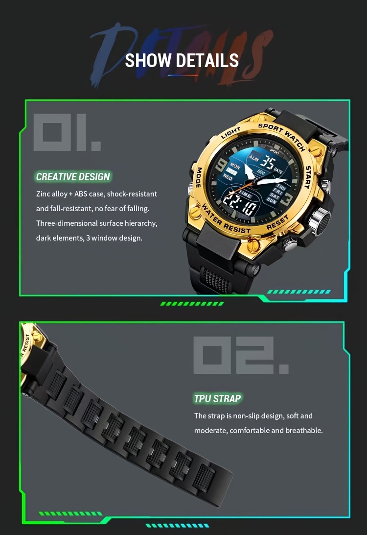 Com estrutura robusta e resistente à água, este relógio desportivo juvenil é ideal para atividades ao ar livre, desportos coletivos ou como acessório fashion no dia a dia. O mostrador intuitivo e os botões de fácil operação tornam-no prático para estudantes ativos, enquanto o visual desportivo e atual se adapta a qualquer situação. Perfeito para oferecer a jovens que apreciam tecnologia e estilo, este relógio eletrónico multifuncional é a fusão perfeita entre inovação e moda juvenil.