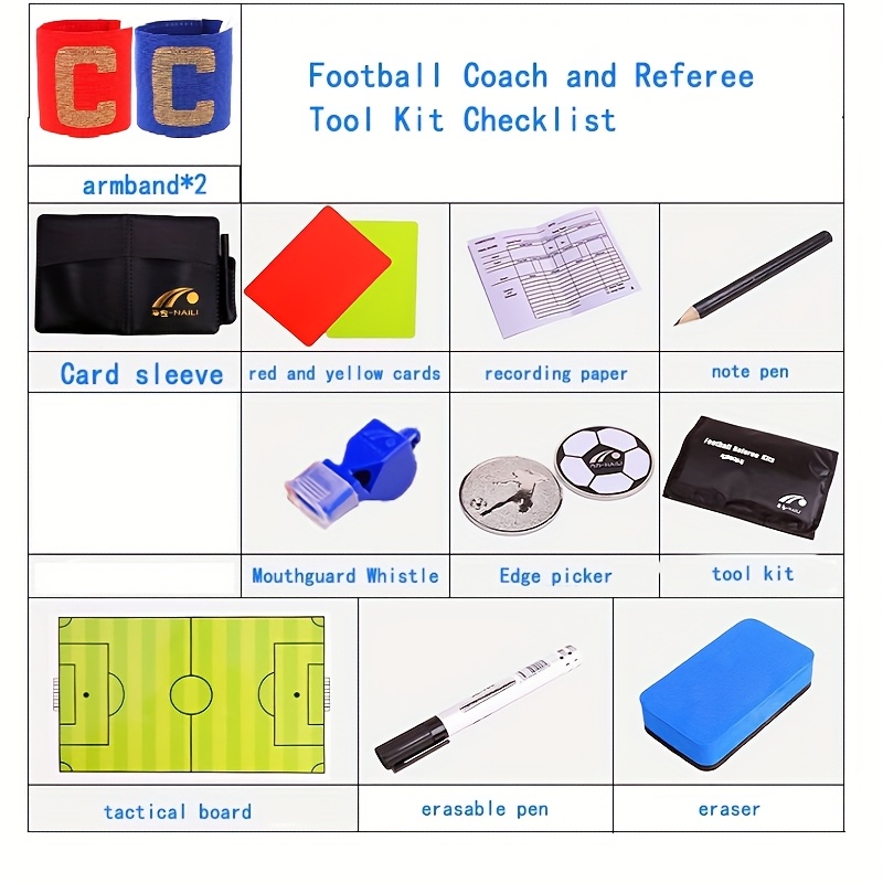 Eleve a profissionalidade do jogo com o Kit Completo de Acessórios para Árbitros de Futebol, um conjunto essencial que inclui tudo o que treinadores e árbitros necessitam para dirigir partidas e treinos com eficiência. Este kit portátil contém um livro de árbitro para anotações, apito de som penetrante, cartões vermelho e amarelo em material durável, quadro tático para estratégias, moeda para sorteio e braçadeira de capitão. Perfeito para jogos oficiais, torneios escolares ou sessões de formação, este conjunto garante que todos os elementos necessários para uma arbitragem organizada estão sempre à mão.
