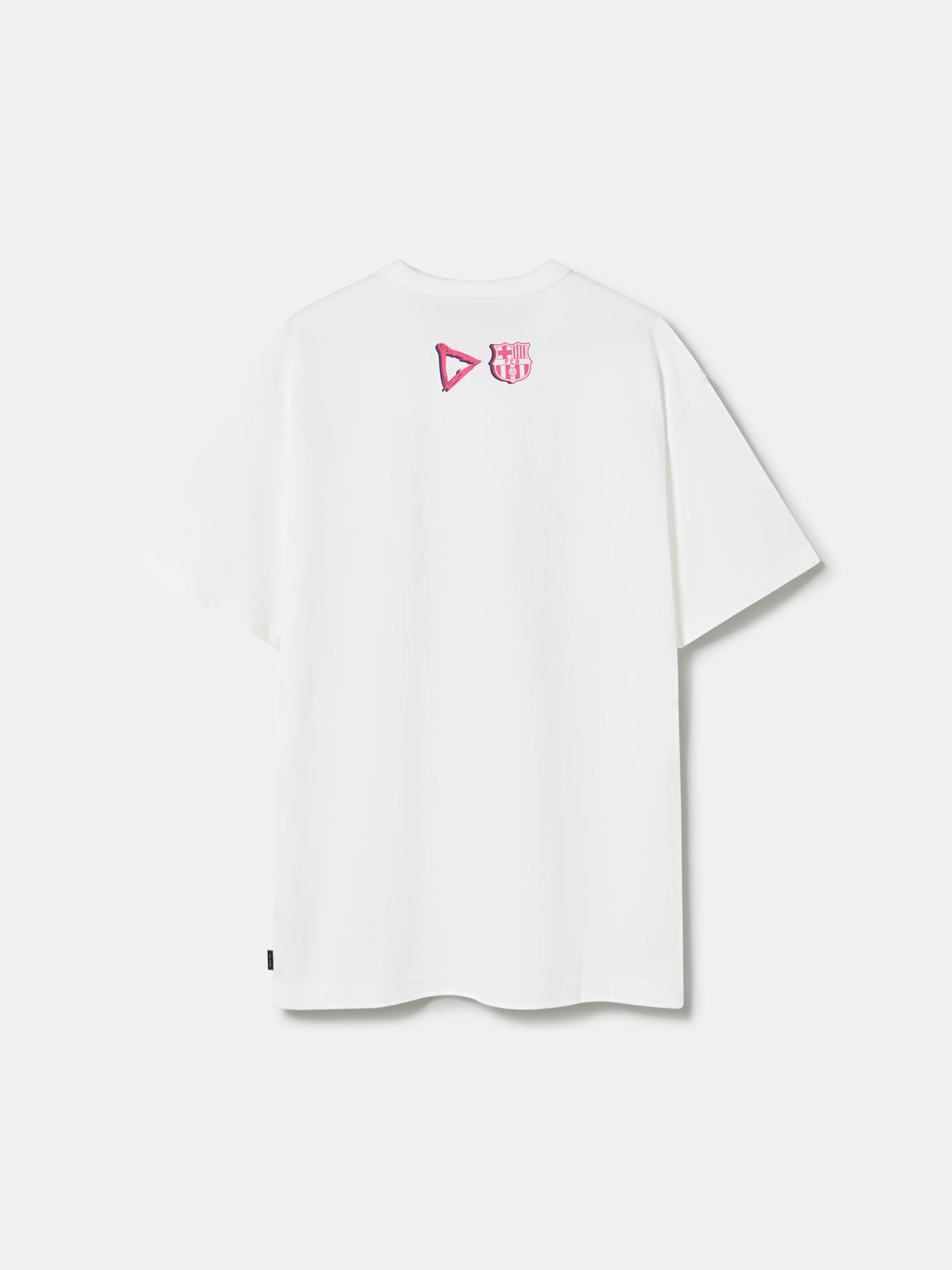 Com um design atraente em branco, esta T-shirt destaca-se pela sua mensagem inspiradora que motiva a ação e a determinação de "Jogar Como o Barça".